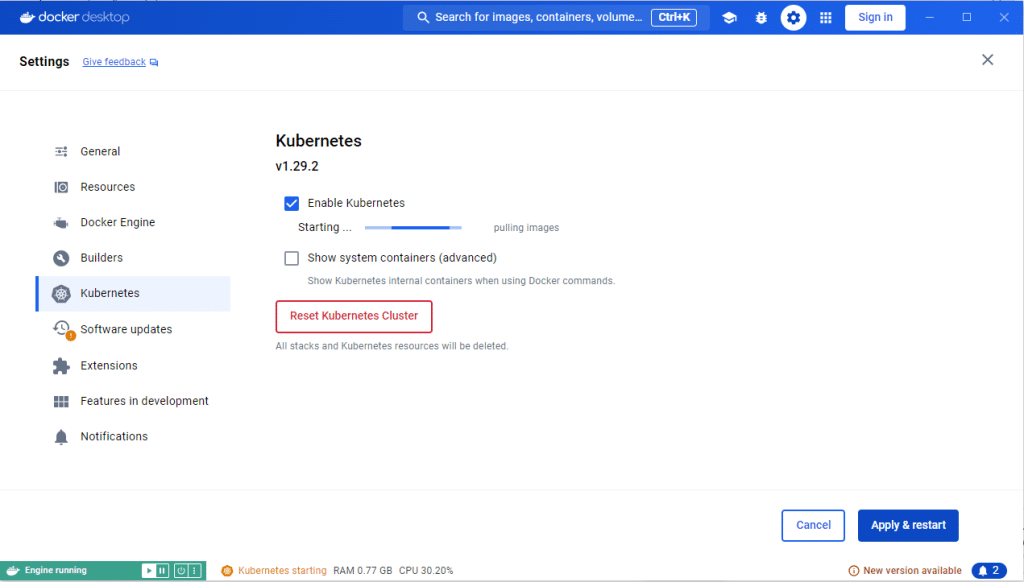 Step 1: To install kubernetes, select Settings in Docker Desktop and click on Kubernetes on the left panel.