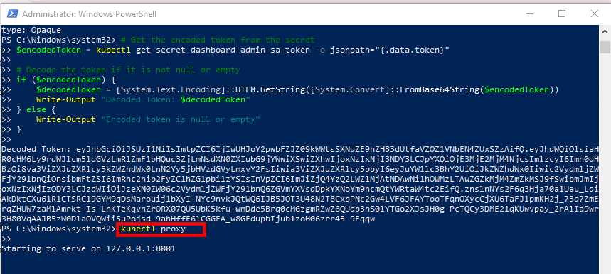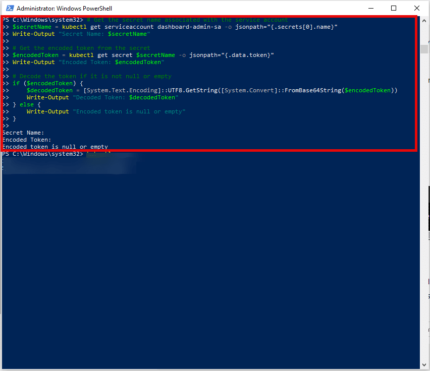 $encodedToken = kubectl get secret dashboard-admin-sa-token -o jsonpath="{.data.token}"