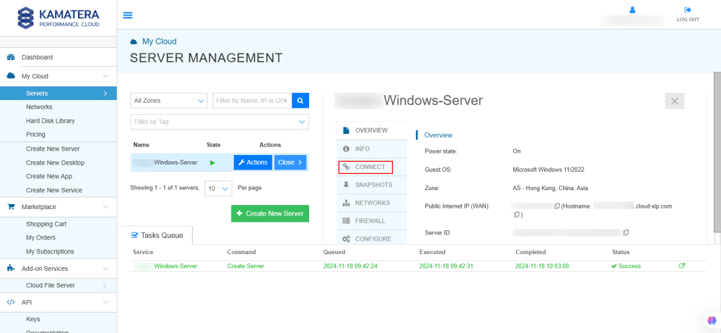 15. Once the server is created, you will see the status as success. The server will appear under Server Management.