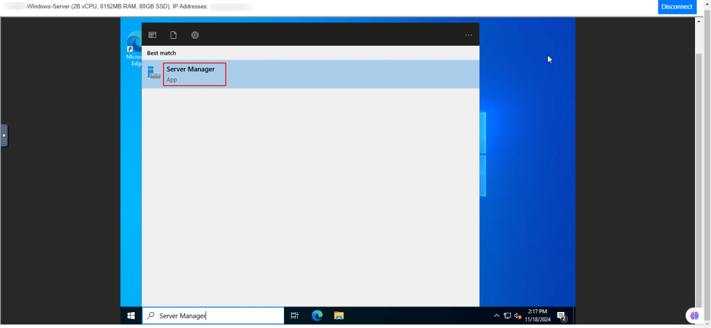 16. On the right side, the overview of the Windows Server that you just created is displayed. Click CONNECT and a new screen will open.