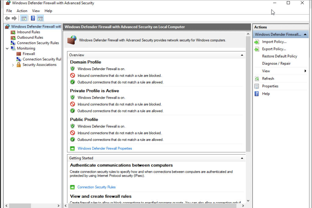 - In the Overview Pane, click Windows Defender Firewall Properties.