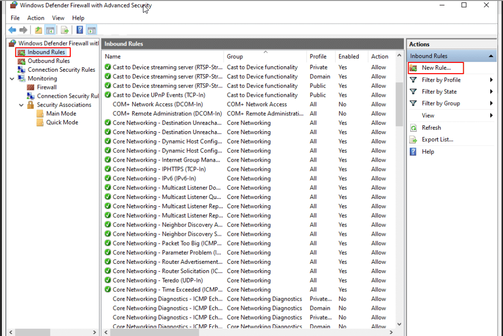 6. Once you click on Inbound rules or Outbound Rules, you will see the Actions pane on the right. Select New Rule.