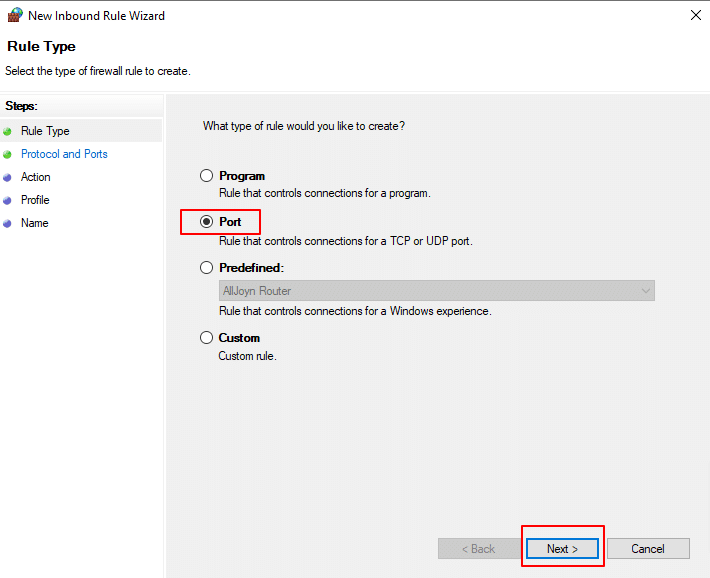 7. A new inbound wizard rule opens. Select the type of firewall rule you want to create (Program, Port, Predefined, or Custom).
