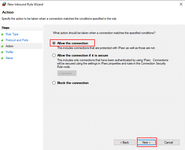 - Select Allow the connection, Allow the connection if it is secure, or Block the connection.