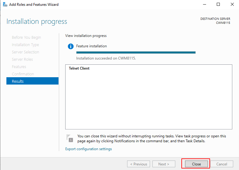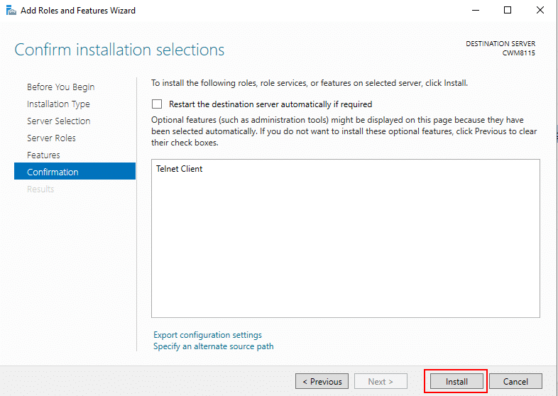 In the Select Features window, check the box next to Telnet Client and then click Next.