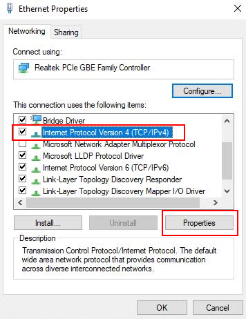 - Select Internet Protocol Version 4 (TCP/IPv4) and click Properties.