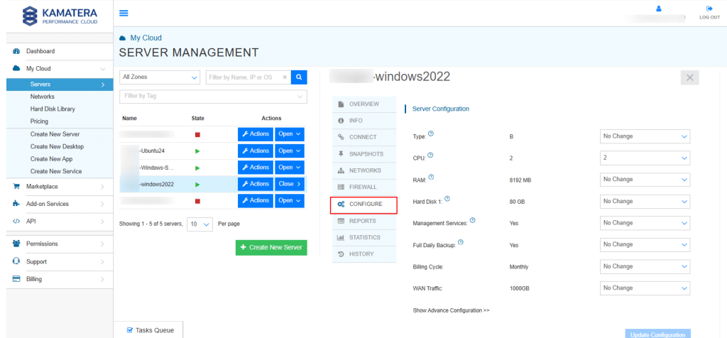 In the Server Management dashboard, click Actions button beside the server. From the drop-down menu, select Reboot.