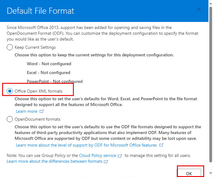 10. A new window opens. Select Office Open XML formats and Click Ok.