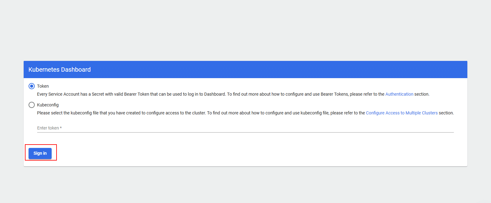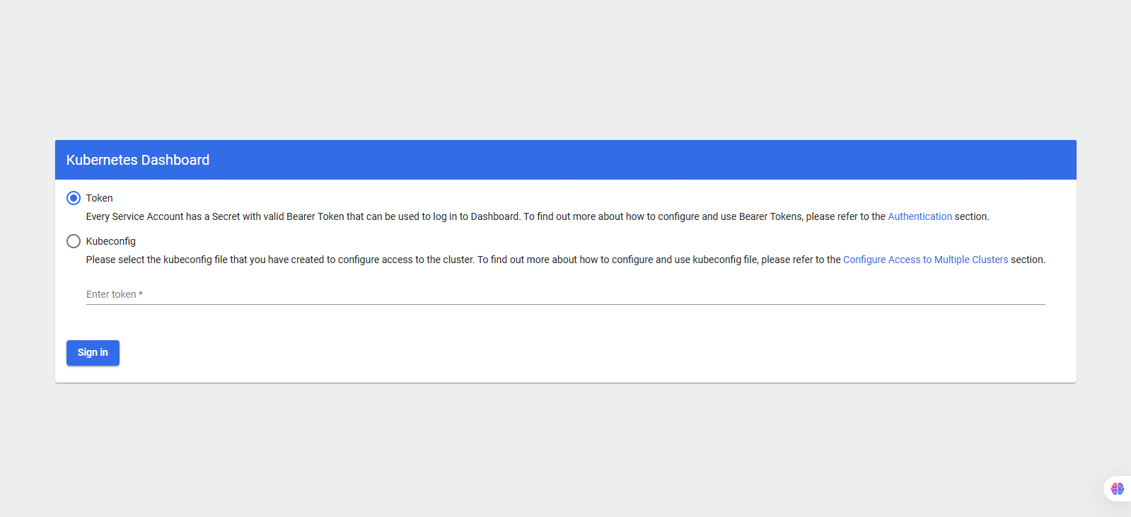Paste the copied token into the Kubernetes dashboard login screen and click Sign in.