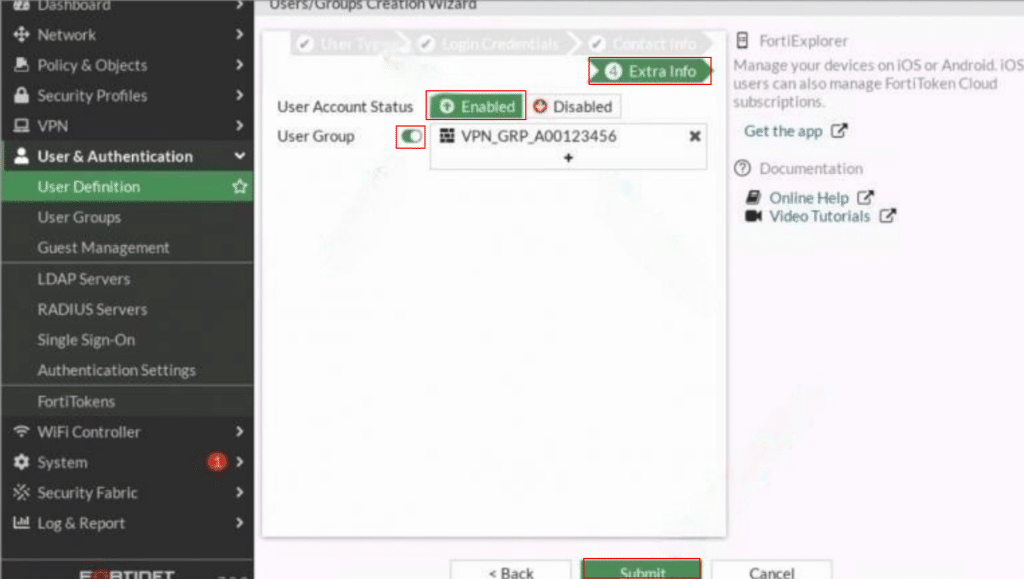 In the final step, Extra Info, set User Account Status to Enabled. Toggle the User Group option to On and select the appropriate User Group (e.g., VPN_GRP_A00123456) for the user profile. Then click Submit.