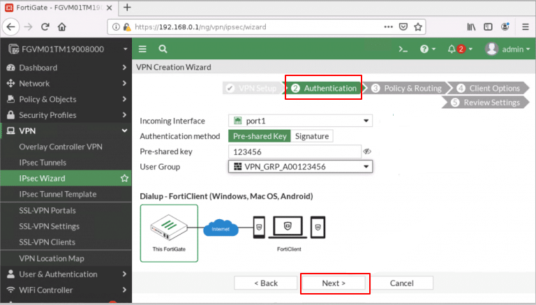 - Authentication Method: Select Pre-Shared Key (set a secure key that both FortiGate and FortiClient will use).