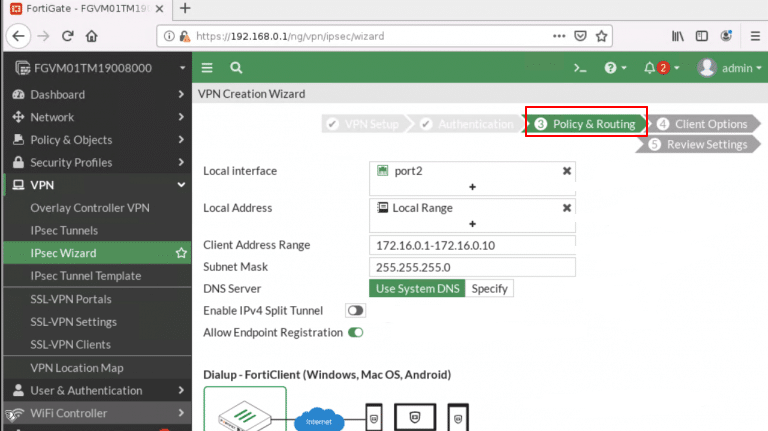 - Remote Device Type: Choose Client-based and select FortiClient, since that’s the client software.