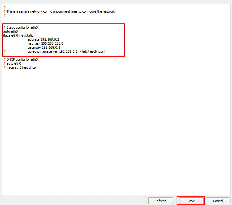 In the same network configuration file, locate the section labeled Static config for eth0. Remove the # symbols at the beginning of each line to enable the static configuration.