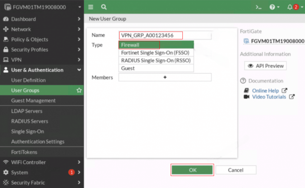 Enter a Name (e.g., VPN_GRP_A00123456) and Type (e.g., Firewall). Click OK to save the group.